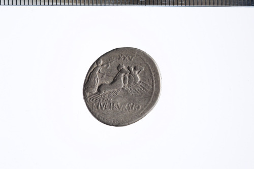 Dritto: Testa maschile a d. laureata, con le ali e con dietro un tridente (attributi di Apollo, Mercurio e Nettuno); dietro come simbolo un timone; c.p.. Rovescio: Vittoria in quadriga a d. che regge le redini con la mano s. e una corona con la d.; c.p.