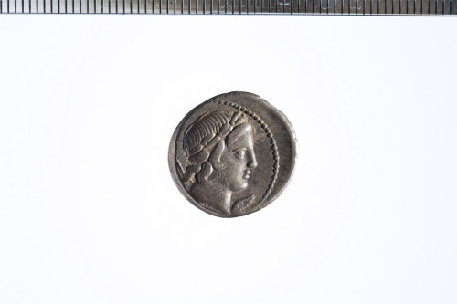 Dritto: Testa laureata di Apollo ? a d. con dietro uno scettro; davanti una foglia; c.p.. Rovescio: Cavaliere al galoppo a d. brandendo una lancia; c.p.