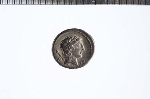 Dritto: Testa laureata di Apollo? a d. con dietro uno scettro; davanti un simbolo non meglio identificabile; c.p.. Rovescio: Cavaliere al galoppo a d. brandendo una lancia; c.p.