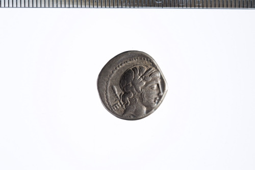 Dritto: Testa laureata di Apollo? a d. con dietro uno scettro; davanti un simbolo non meglio identificabile; c.p.. Rovescio: Cavaliere al galoppo a d. brandendo una lancia; c.p.