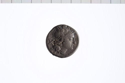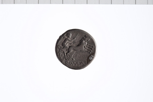 Dritto: Testa di Roma con elmo a d.,contorno perlinato.. Rovescio: Luna in biga a d. con redini nella mano s. e bastone nella d. Cavalli al galoppo. Contorno lineare.
