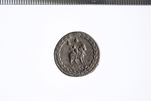 Dritto: Testa laureata di Apollo a d. con sotto un fulmine; c.p.. Rovescio: Cupido su un caprone a d.; sopra i pilei ; in esergo un thyrsus, in tutto all'interno di una corona d'alloro; c.p.