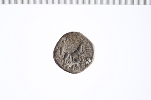 Dritto: Testa femminile a d. con diadema. Contromarca a d. Contorno perlinato.. Rovescio: Diana in biga di cervi a d. con scettro e redini nella mano s. e torcia nella d., faretra in spalla. Sotto la biga una cavalletta. Corona d'alloro.