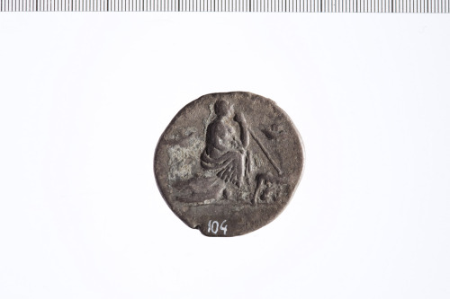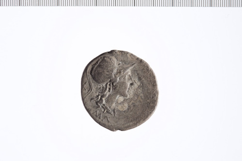 Dritto: Testa elmata di Roma a d. con elmo corinzio e ricciolo sulla spalla s. Contorno perlinato.. Rovescio: Roma con elmo corinzio seduta su una pila di scudi, tiene una lancia nella mano s., ai suoi piedi un elmo e la lupa che allatta i gemelli, su ciascun lato un uccello in volo. Contorno perlinato.