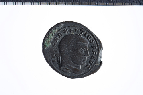 Dritto: Busto laureato di Massenzio a d.; contorno perlinato.. Rovescio: Vittoria incedente a s. con ghirlanda e ramo di palma; contorno perlinato.