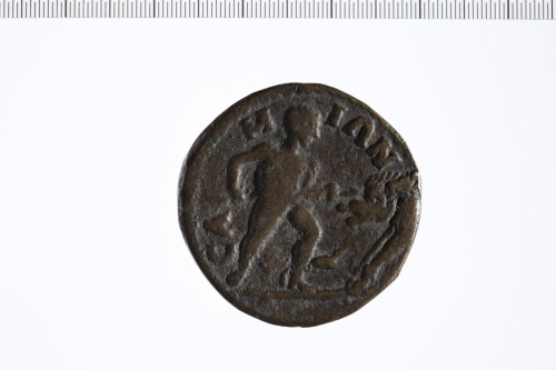 Dritto: Busto drappeggiato di Giulia Maemea a d.. Rovescio: Cacciatore nudo a d. che caccia con lancia un verro a s., dietro di lui un segugio che sta attaccando il verro.