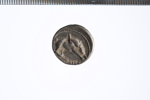 Dritto: Busto drappeggiato di Diana a d. con arco e faretra sopra le spalle; c.p.. Rovescio: Cinghiale ferito da una lancia e attaccata da un cane a d.; c.p.