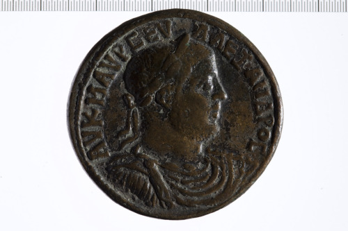 Dritto: Busto di Severo Alessandro a d. laureato, corazzato e drappeggiato.. Rovescio: Giove seduto a s., regge con la d. patera e con la s. scettro; in basso a s. aquila e sotto Gaia e Thalassa sdraiate; in alto a s. Luna in quadriga a d. con sopra crescente e a d. Sole in quadriga a s. con sopra sole; intorno circolo formato dai segni zodiacali.