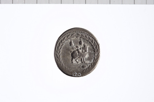 Dritto: Testa laureata di Apollo a d. con sotto un fulmine. Cerchio perlinato.. Rovescio: Cupido su capra; sopra pilei, in esergo tyrsus, con attorno ghirlanda d'alloro. Cerchio perlinato.