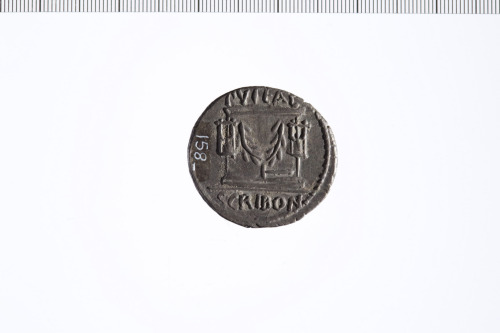 Dritto: Testa di Bonus Eventus a d. Cerchio perlinato.. Rovescio: Puteal Scribonianum decorato con ghirlanda e lire; alla base martello. Cerchio perlinato.