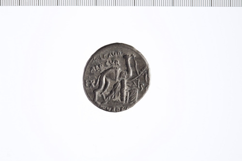 Dritto: Cammello a d. con figura inginocchiata che tiene le redini nella mano s. e un ramo di ulivo nella mano d. Cerchio perlinato.. Rovescio: Giove in quadriga a d. tiene le redini nella mano s. e un fulmine nella mano d. sotto scorpione. Cerchio perlinato
