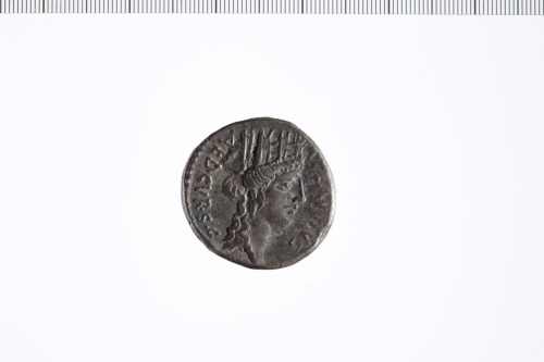 Dritto: Testa di Cibele a d. Cerchio perlinato.. Rovescio: Cammello a d.; davanti figura inginocchiata tiene le redini nella mano s. e un ramo di ulivo nella d. Cerchio perlinato.
