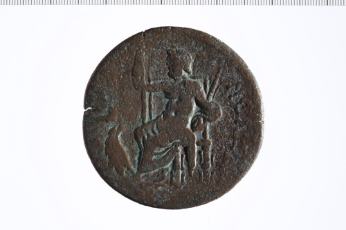 Dritto: Busto laureato di Adriano a d., paludato, di tre quarti, di spalle.. Rovescio: Zeus laureato, seduto a s., riposa la d. sopra scettro, tiene nella s. un fulmine; ai suoi piedi aquila a riposo a s., gira la testa a d.; sullo schienale del trono una figura di Nike a s. tiene corona e palma.