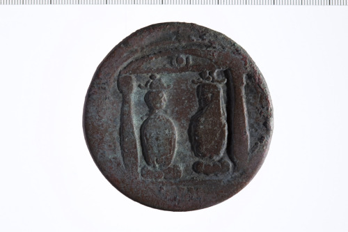 Dritto: Busto laureato di Adriano a d., paludato, di tre quarti, di spalle.. Rovescio: Tabernacolo dei canopi. Due colonne sopportano un'architrave con frontone semicircolare sul quale vi è un disco tra due urei. Tra le colonne due canopi affrontati; quello di s. rivolto a d., porta un berretto con sopra corona di Atef; quello di d. rivolto a s., porta parrucca con corna d'ariete, disco e penne. Entrambi i canopi sono posti su guanciali.