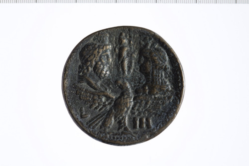 Dritto: Busto laureato di Adriano a d., paludato, corazzato, di tre quarti, di spalle.. Rovescio: Busti affrontati di Serapide e Iside; Iside porta corna di bue, disco e penne tra due spighe. Tra loro Harpokrate in piedi, nudo a s., porta skent, la d. alla bocca. Sotto, aquila a d., gira la testa a s. con ali spiegate.
