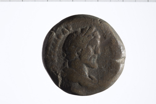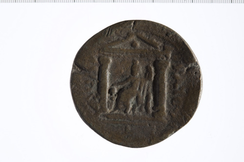 Dritto: Busto laureato di Antonino Pio a d., paludato, di profilo.. Rovescio: Tempio con due colonne e timpano triangolare con disco centrale; tra le colonne, Serapide seduto su trono a s., riposa la s, su scettro e tende la d. verso Cerbero, seduto a terra.