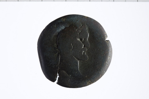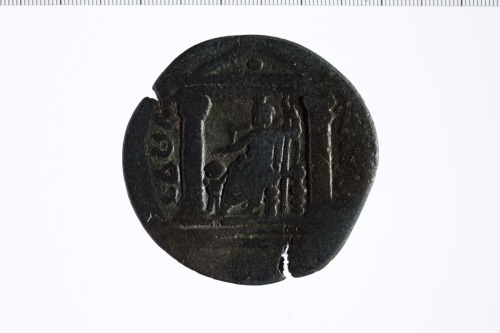 Dritto: Testa laureata di Antonino Pio a d.. Rovescio: Tempio a due colonne che supportano un timpano triangolare con disco centrale; tra le colonne, Serapide seduto su trono a s., riposa la s. su scettro e protende la d. verso Cerbero seduto a terra.