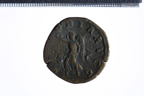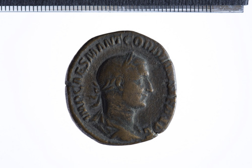 Dritto: Busto laureato di Gordiano II a d. con corazza (?) e paludamentum, di tre quarti di spalle; contorno perlinato.. Rovescio: Vittoria avanzante a s., reggente palma nella s. e corona nella d. protesa; contorno perlinato.
