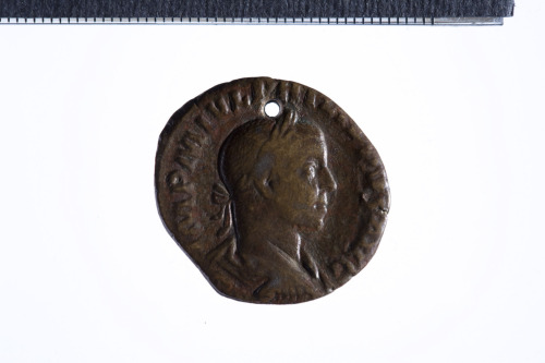 Dritto: Busto laureato di Filippo II a d. con corazza e paludamentum, di tre quarti di spalle; contorno perlinato (?).. Rovescio: Capra avanzante a s.; contorno perlinato (?).
