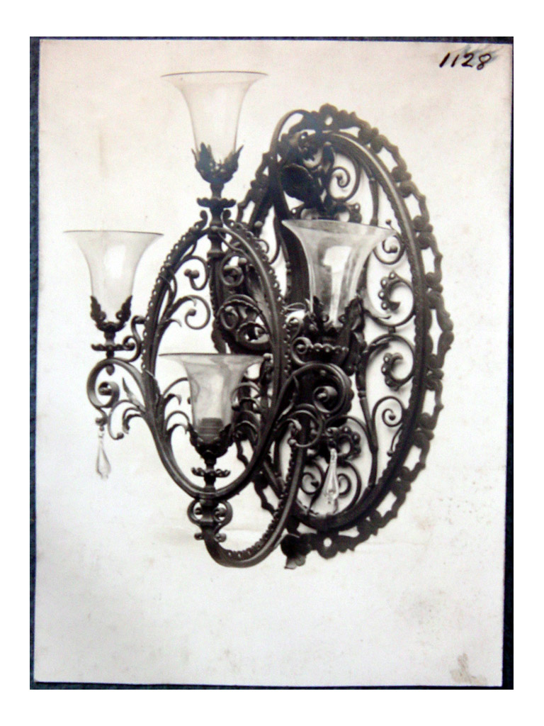 La foto ritrae una grande lampada su placca a muro traforata a volute con quattro campane in vetro, corrispondente al pezzo INVN.1067 della Galleria.