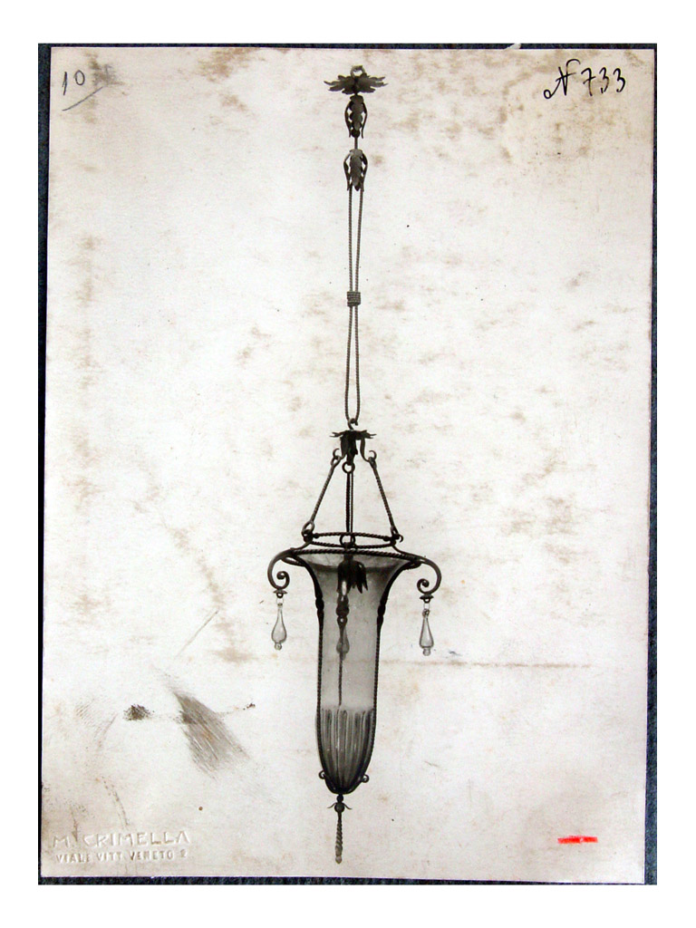 La foto ritrae un lampadario con vetro a cestello e lunga campana in vetro con gocciolature decorative, che ricorda il pezzo INVN.1406 della Galleria, ma senza i pendenti a forma di scudo. Appare contrassegnata, come altre nell'album, da un segno rosso in basso a destra.