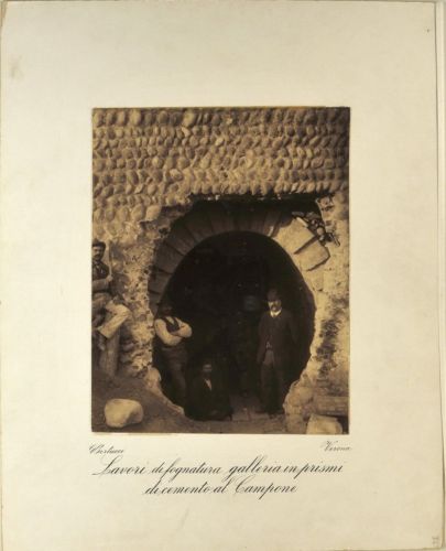 - ISCRIZIONI sul supporto secondario: recto: in basso al centro - Lavori di fognatura galleria in prismi di cemento al Campone - a matita -