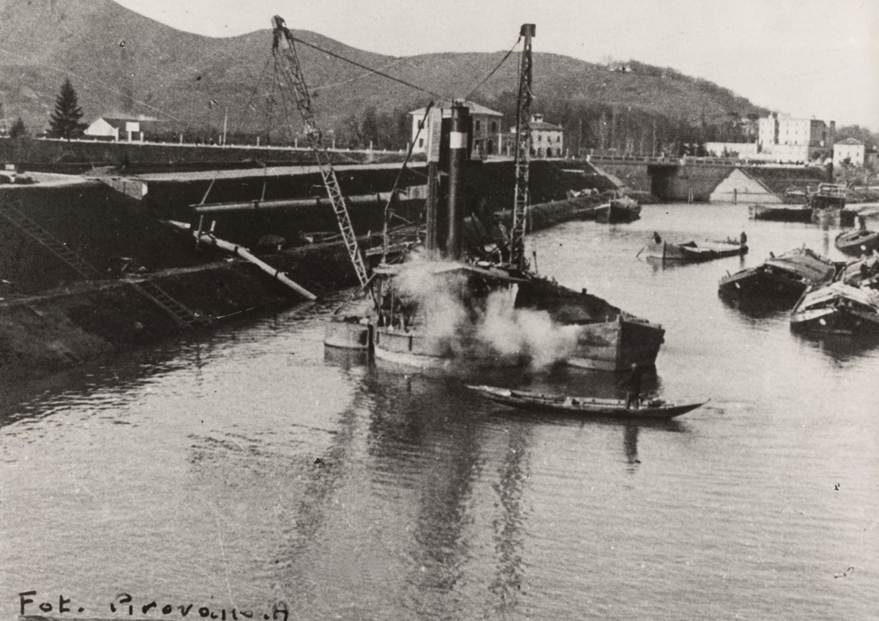 Battaglia Terme, 1943. Draga al lavoro per ripulire il mandracio inferiore della conca di navigazione.