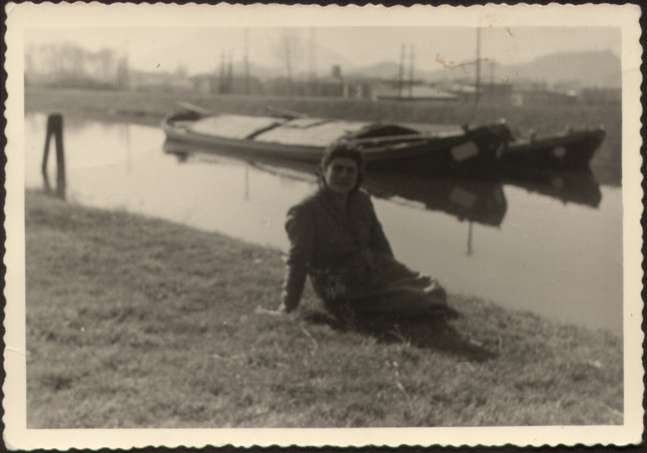 Foto ricordo di una giovane donna sull'argine del canale Battaglia.