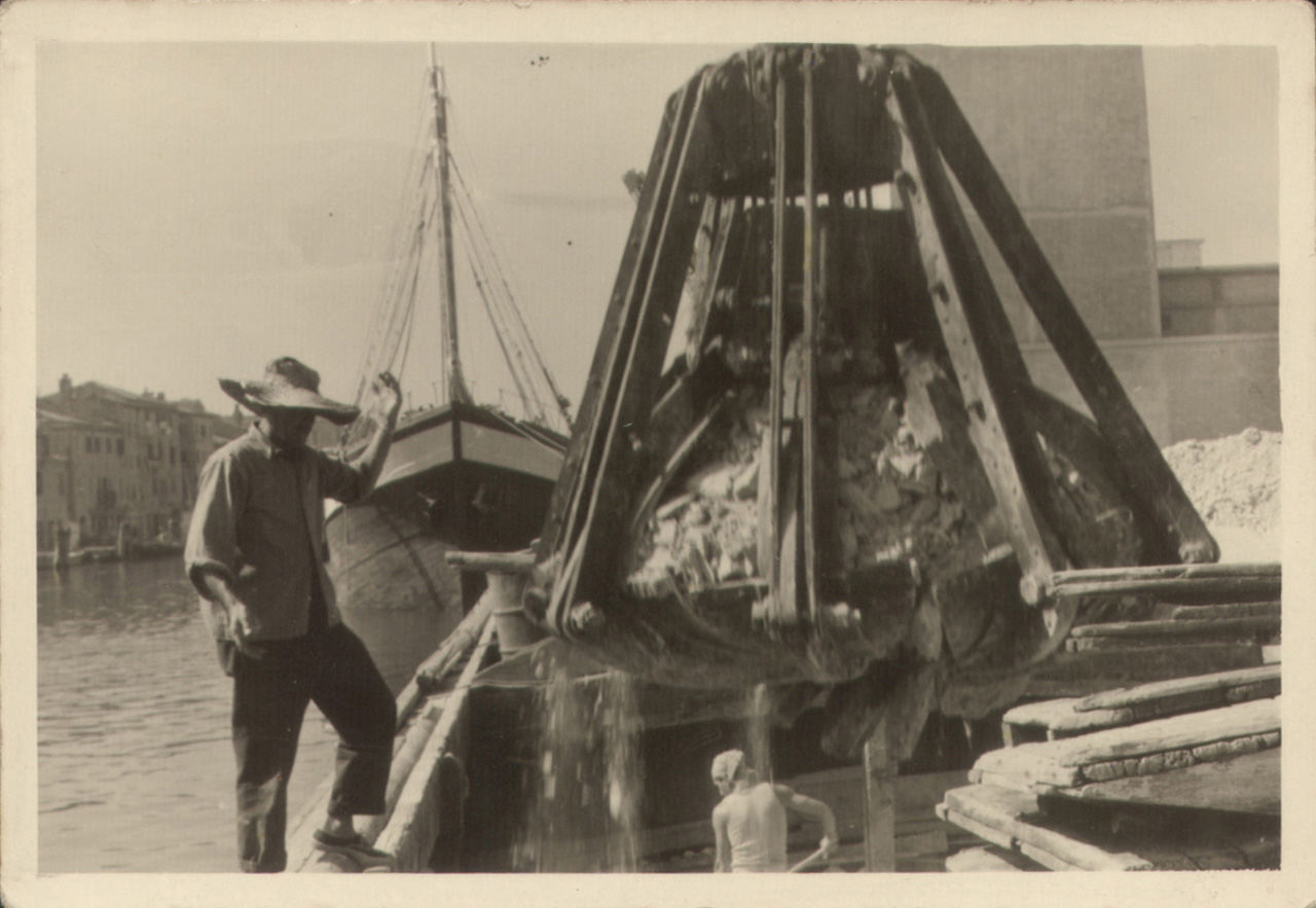 Chioggia, porto, anni '50. Il barcaro guida el granso (benna) che sta scaricando il calcare dalla sua imbarcazione.