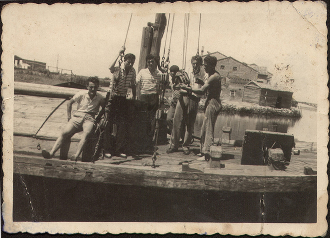 Giovani ragazzi a bordo di un burcio in navigazione lungo il canale Lombardo.
