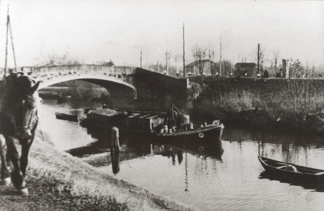 Traino di un burcio per mezzo di cavalli lungo il fiume Brenta a Padova.