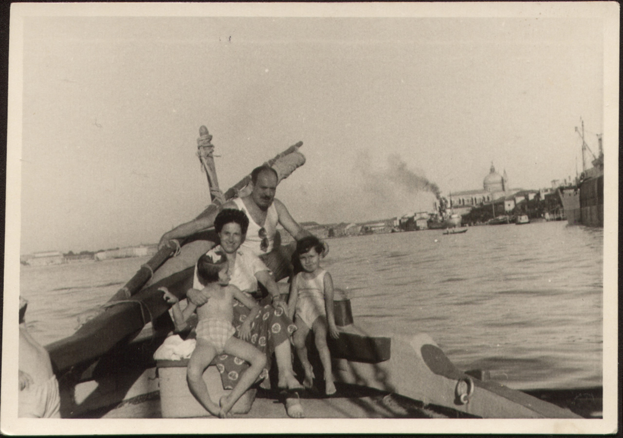 Foto ricordo di un gruppo di parenti del barcaro Riccardo Cappellozza in barca a Venezia.