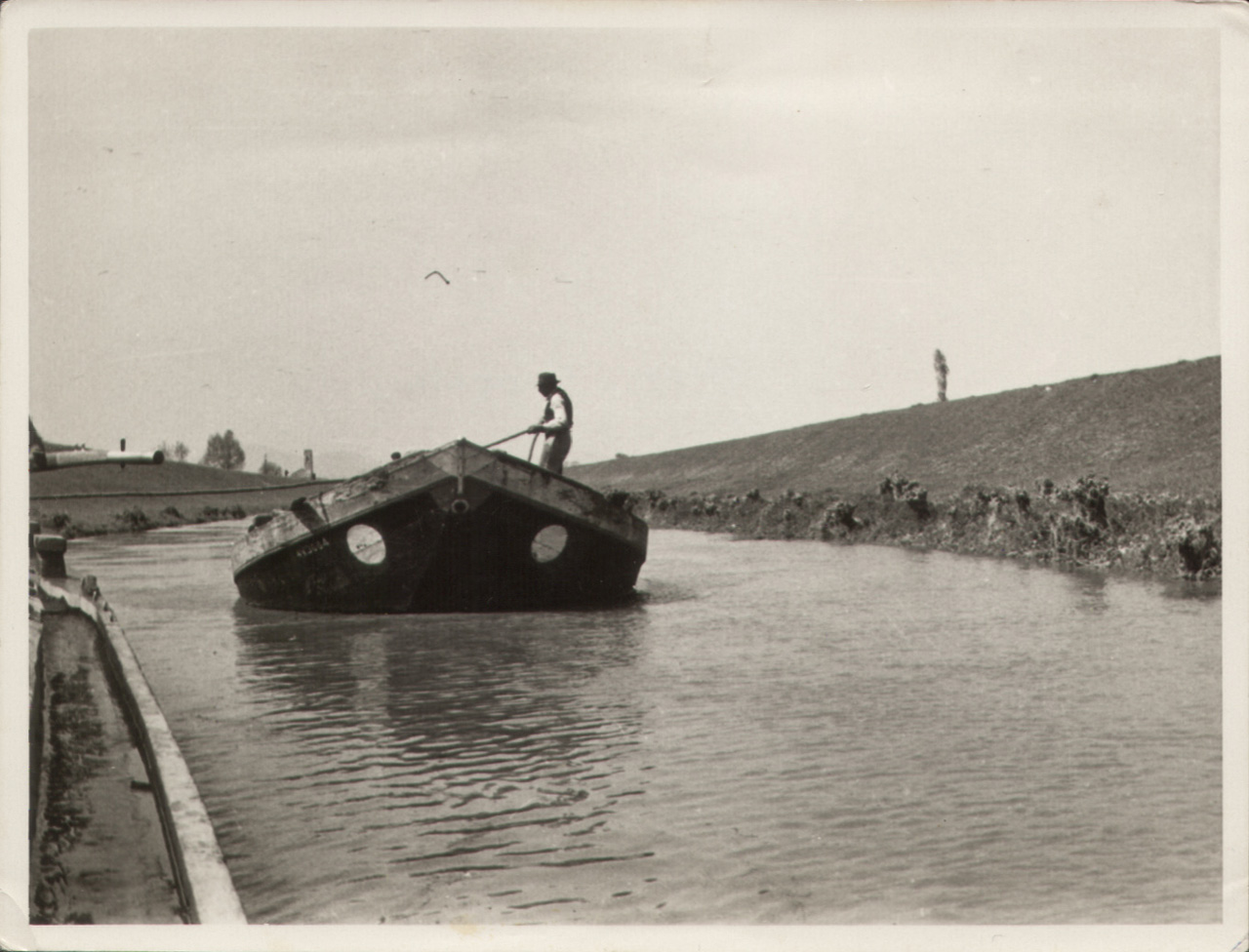 Canale Vigenzone tra Gorgo e Bovolenta, anni '50. Barca trainata in viaggio verso Chioggia; il barcaro sta lascando la sima.