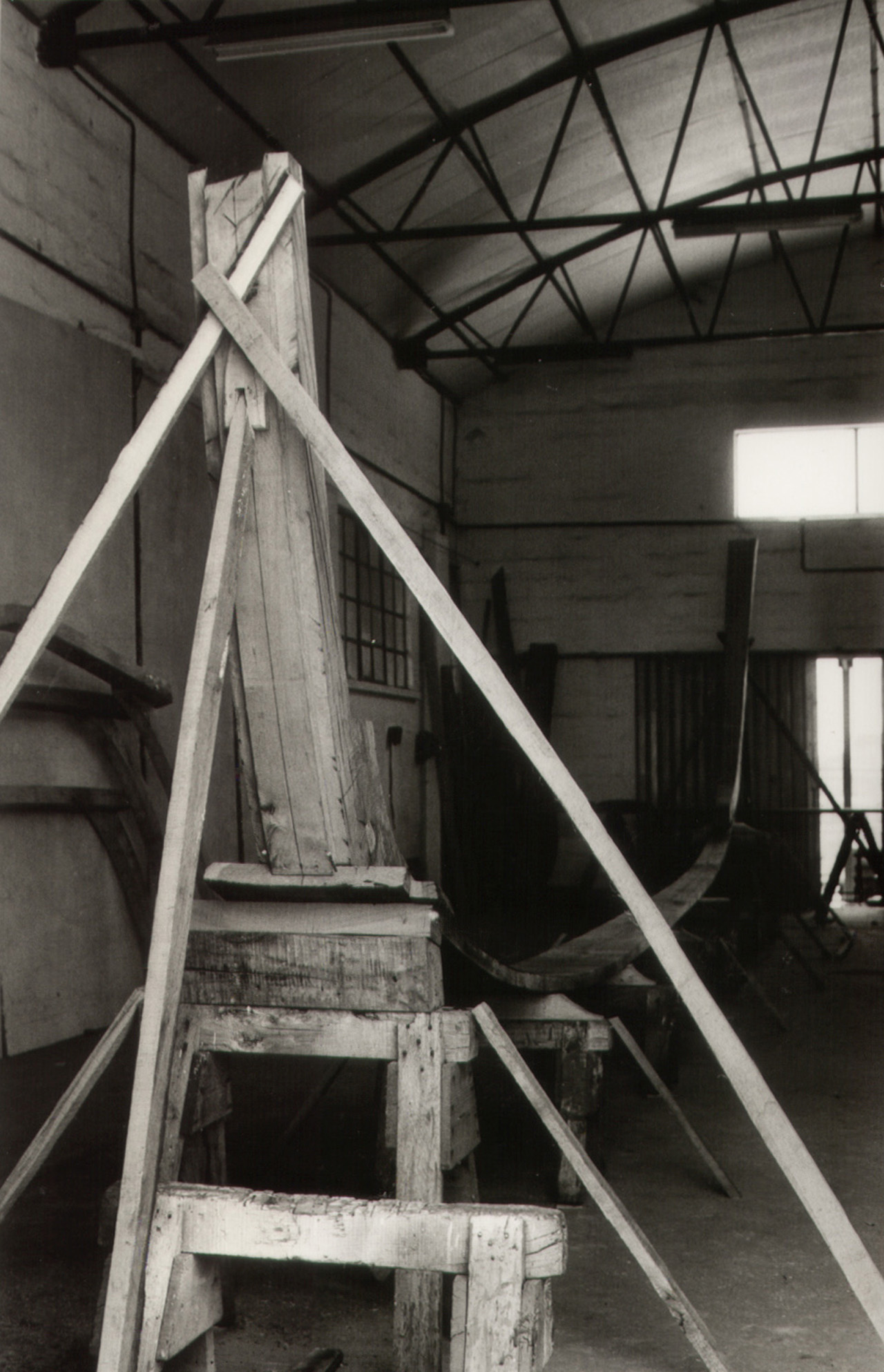 Loreo, Cantiere dei F.lli Doni, 1979. Prima fase di costruzione di una barca. La colonba è sulle careghe e l'asta di prua e il dritto di poppa sono impostati. La linea di fondo della barca è tracciata.