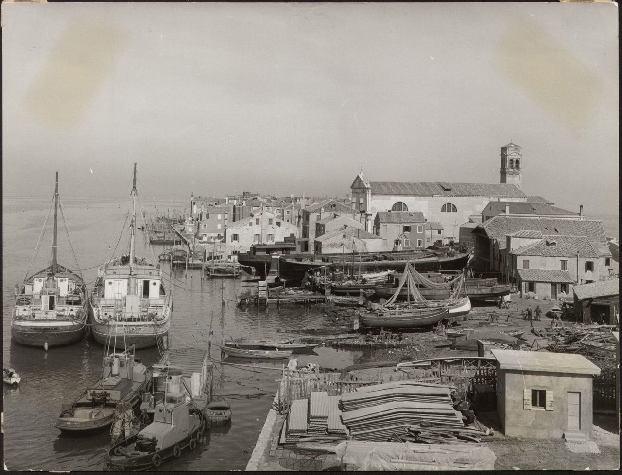Pellestrina, cantiere del Proto, 1961. Qui si costruivano in massima parte imbarcazioni da pesca lagunare, ma venivano anche riparate o costruite barche da trasporto tipo burcio; notare la varietà delle imbarcazioni in mostra tra le quali spicca nettamente la sagoma del burcio.
