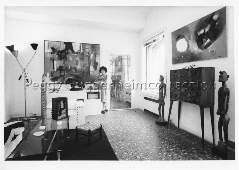 Peggy Guggenheim in the living room of Palazzo Venier dei Leoni; on the walls (left to right) Edmondo Bacci, "Factory" (1952, unknown location), "Event #292" (1958, PGC); on the table Joseph Cornell, "Fortune Telling Parrot" (1937-38 ca., PGC); Venice, early 1960s.
