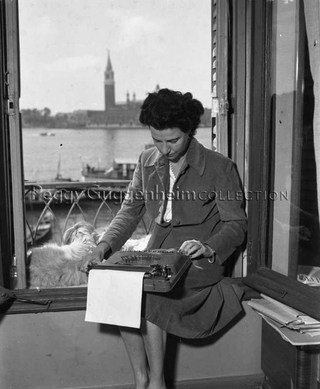 Peggy Guggenheim at her typewriter in her room at the Hotel Savoia & Jolanda, along Riva degli Schiavoni, Venice, 1949