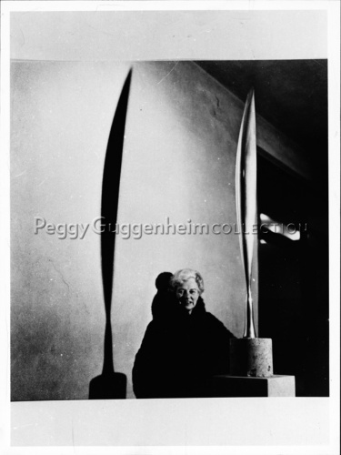 Peggy Guggenheim accanto ad "Uccello nello spazio" di Constantin Brancusi, alla Tate Gallery, nel 1964