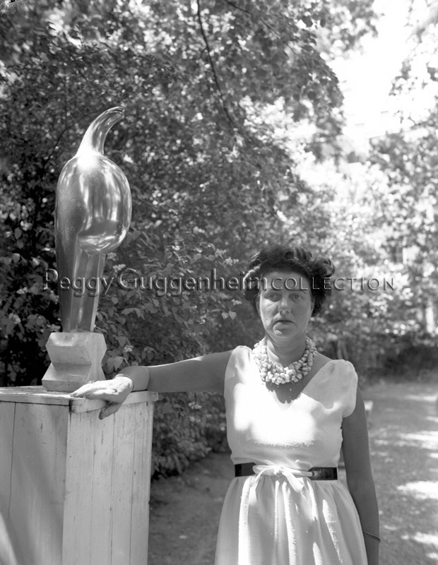 Peggy Guggenheim nel giardino di Palazzo Venier dei Leoni accanto a Constantin Brancusi, "Maiastra" (1912, PGC); Venezia, 1949