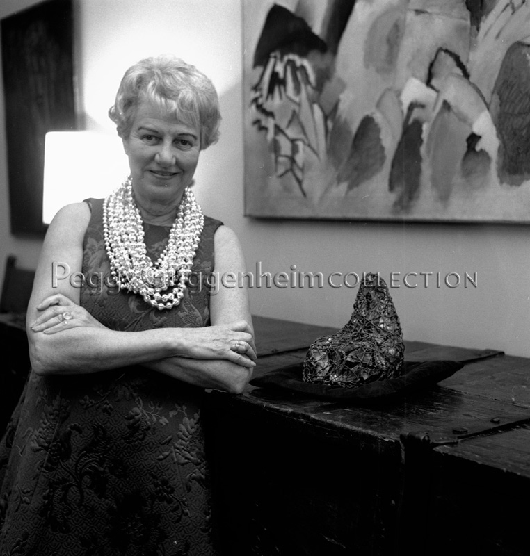 Peggy Guggenheim in the dining room of Palazzo Venier dei Leoni next to Claire Falkenstein, "Doge?s Crown" (unknown date and location); behind her Vasily Kandinsky, "Landscape with Red Spots, No. 2" (1913, PGC); Venice, 1962