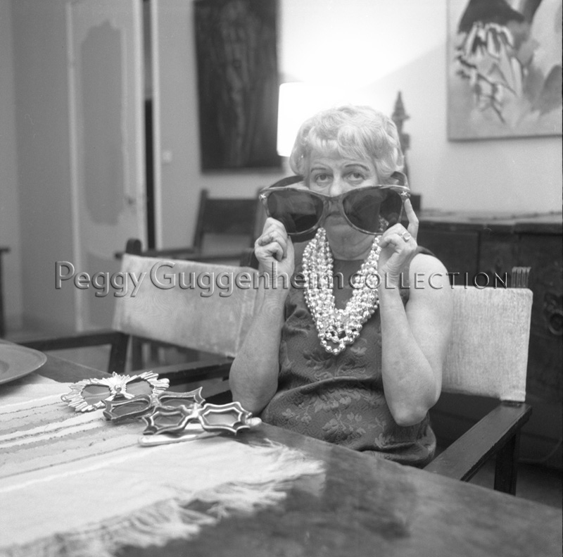 Peggy Guggenheim in the dining room of Palazzo Venier dei Leoni with a pair of glasses purpose-designed for her; behind her (left to right) a male figure from her collection of sculptures from the Americas, Vasily Kandinsky, "Landscape with Red Spots, No. 2" (1913, PGC), Claire Falkenstein, "Doge's Crown" (unknown date and location); Venice, 1962