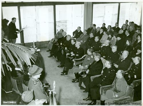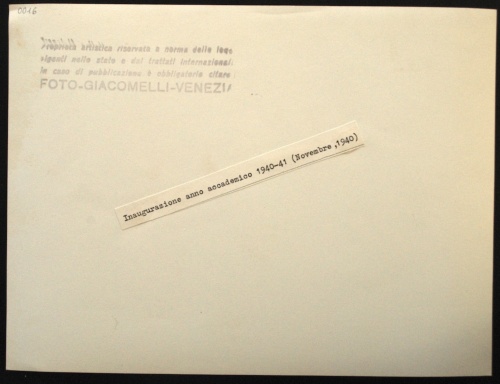 - NOTIZIE STORICO CRITICHE Fotografia individuata da Giannantonio Paladini nel 2001 e soggettata: "Inaugurazione Anno Accademico 1940" (cartella n. 3). All'interno della cartella che contiene la fotografia compare anche un foglio dattiloscritto: "INAUGURAZIONE ANNO ACCADEMICO 1940=41 XIX (9 novembre 1940".