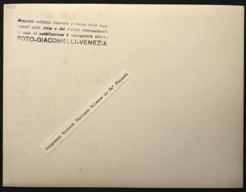 - NOTIZIE STORICO CRITICHE Fotografia individuata da Giannantonio Paladini nel 2001 e soggettata: "Congresso della Soc. Italiana per il Risorgimento delle Scienze tenuto in Ca' Foscari 1937" (cartella n. 5). All'interno della cartella che contiene la fotografia compare anche un foglio dattiloscritto sul quale si legge: "Congresso della Soc. Italiana per il Risorgimento delle Scienze tenuto in Ca' Foscari (settembre 1937).
