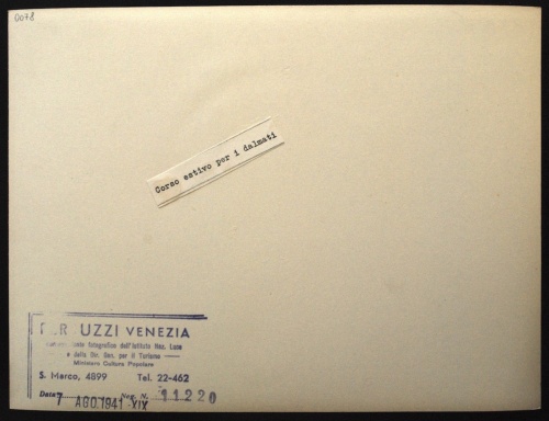 - NOTIZIE STORICO CRITICHE Fotografia individuata da Giannantonio Paladini nel 2001 e soggettata: "Corso estivo per i dalmati (1943)". La soggettazione originaria riporta i dati dattiloscritti rispettivamente, su due fogli relativi alla cartella: "Corso estivo per i Dalmati (1942)"; "Locali dell'Istituto - Fotografie" (cartella n. 14).