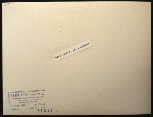 - NOTIZIE STORICO CRITICHE Fotografia individuata da Giannantonio Paladini nel 2001 e soggettata: "Corso estivo per i dalmati (1943)". La soggettazione originaria riporta, dattiloscritto, rispettivamente, su due fogli relativi alla cartella: "Corso estivo per i Dalmati (1942)"; "Locali dell'Istituto - Fotografie" (cartella n. 14).
