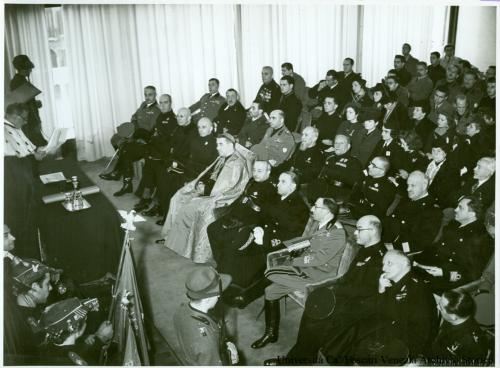 - NOTIZIE STORICO CRITICHE Fotografia individuata da Giannantonio Paladini e soggettata: "Inaugurazione dell'Anno Accademico 1939" (cartella n. 18). Sul medesimo supporto (busta di carta intestata "Università Ca' Foscari Venezia") compare anche la nota manoscritta a penna "Saggio treccani n°4". Un ulteriore supporto di carta dell'epoca contenuto nella medesima cartella riporta la nota dattiloscritta: "Inaugurazione dell'Anno Accademico 1939. = Novembre [?] =".