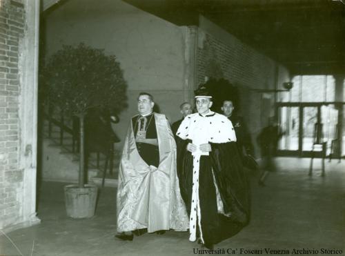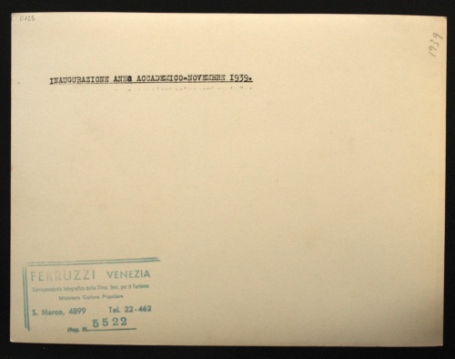 - NOTIZIE STORICO CRITICHE Fotografia individuata da Giannantonio Paladini e soggettata: "Inaugurazione dell'Anno Accademico 1939" (cartella n. 18). Sul medesimo supporto (busta di carta intestata "Università Ca' Foscari Venezia") compare anche la nota manoscritta a penna "Saggio treccani n. 4". Un ulteriore supporto di carta dell'epoca contenuto nella medesima cartella riporta la nota dattiloscritta: "Inaugurazione dell'Anno Accademico 1939. = Novembre [!] =".