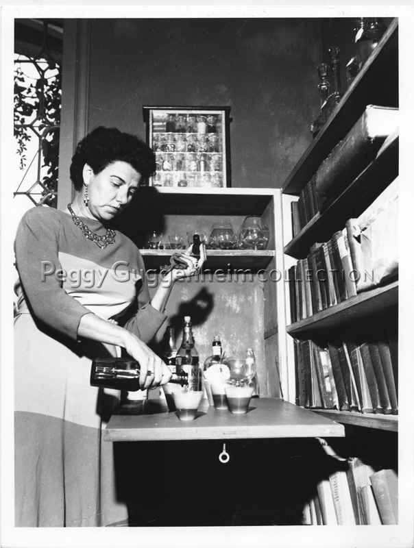 Peggy Guggenheim a Palazzo Venier dei Leoni; alle sue spalle, sulla mensola, Joseph Cornell, "Senza titolo (Farmacia)" (1942 c., PGC); Venezia, 1949