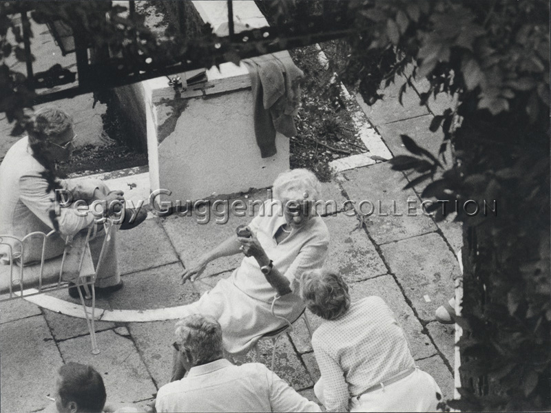 Peggy Guggenheim con Giovanni Carandente e Vittorio Fiorazzo nella terrazza di Palazzo Venier dei Leoni, anni '70