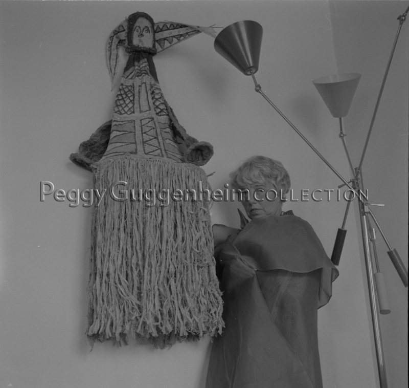 Peggy Guggenheim at Palazzo Venier dei Leoni with a mask from her collection of sculptures from the Americas; Venice, early 1960s